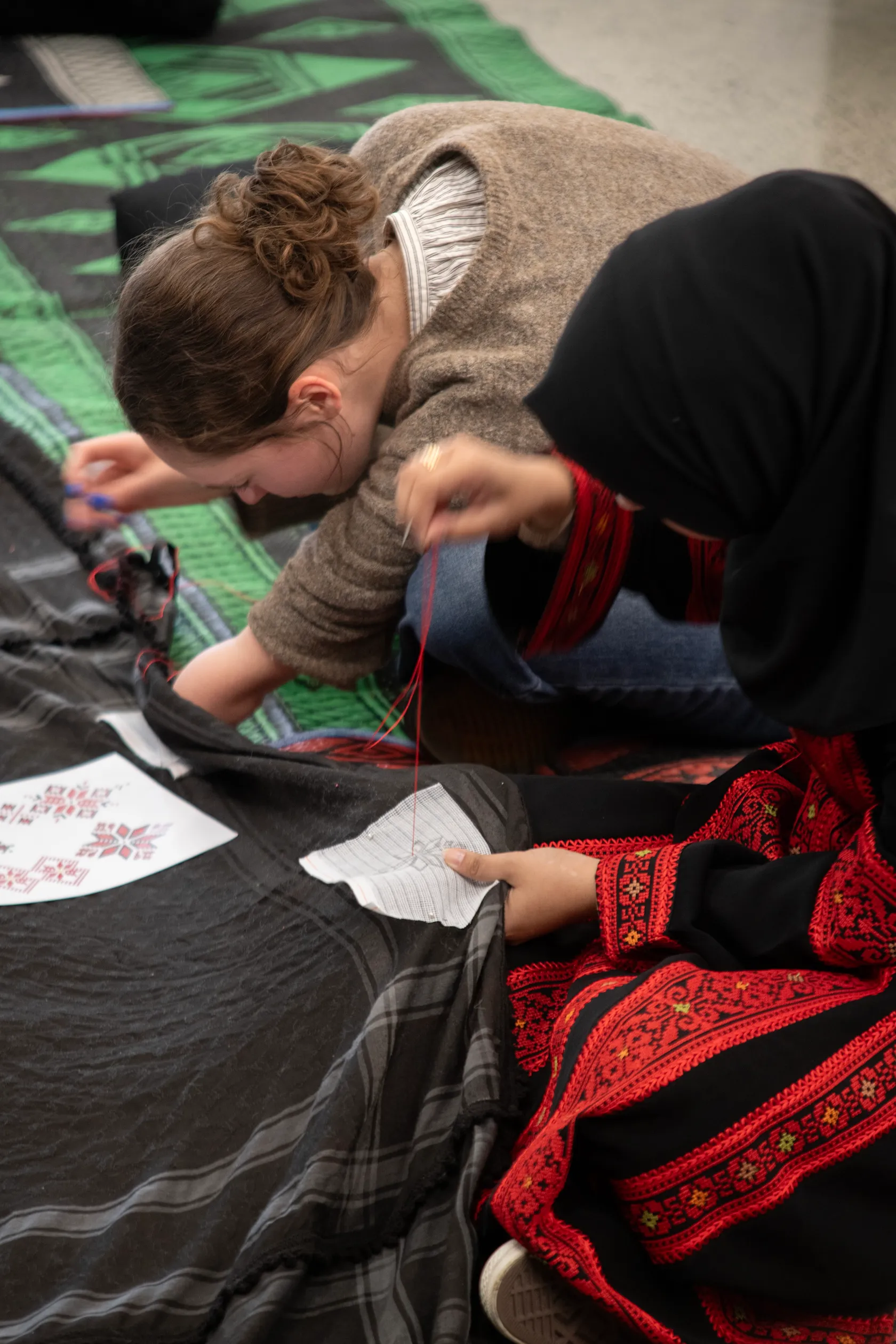 The public is invited to participate in a communal art project that gathers people around a large flag sewn together from 20 keffiyehs, upon which messages of support are embroidered through the timeless art of Tatreez (Palestinian cross-stitch). While embroidery experience is useful, none is required… just a will to make your mark of solidarity on this textile landscape.