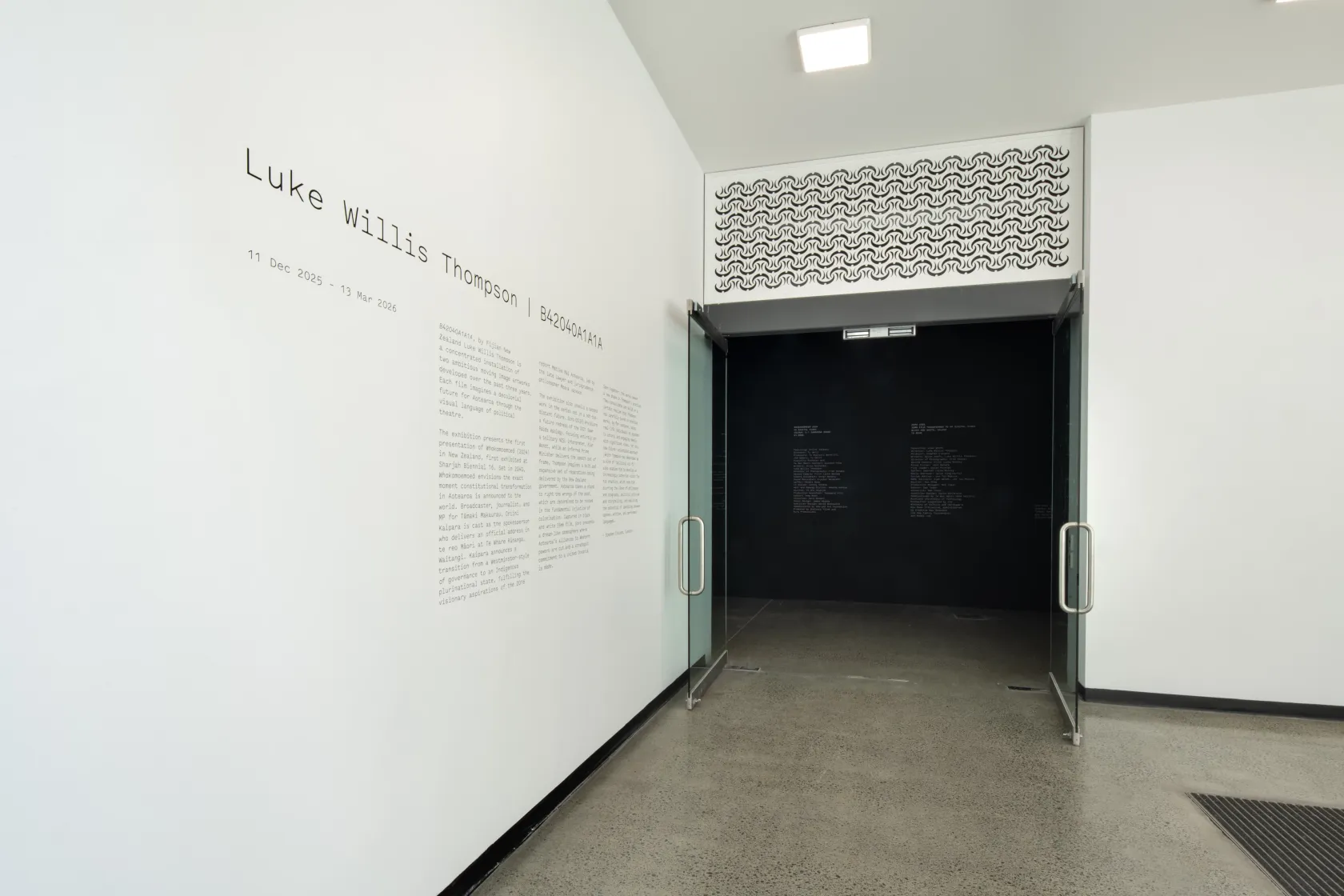 B42040A1A1A is a solo exhibition by Fijian New Zealand artist Luke Willis Thompson. The installation focuses on two major moving image artworks developed over the past three years, which each imagine a decolonial future for Aotearoa through the visual language of political theatre.