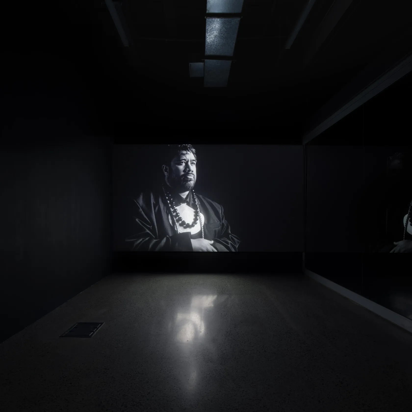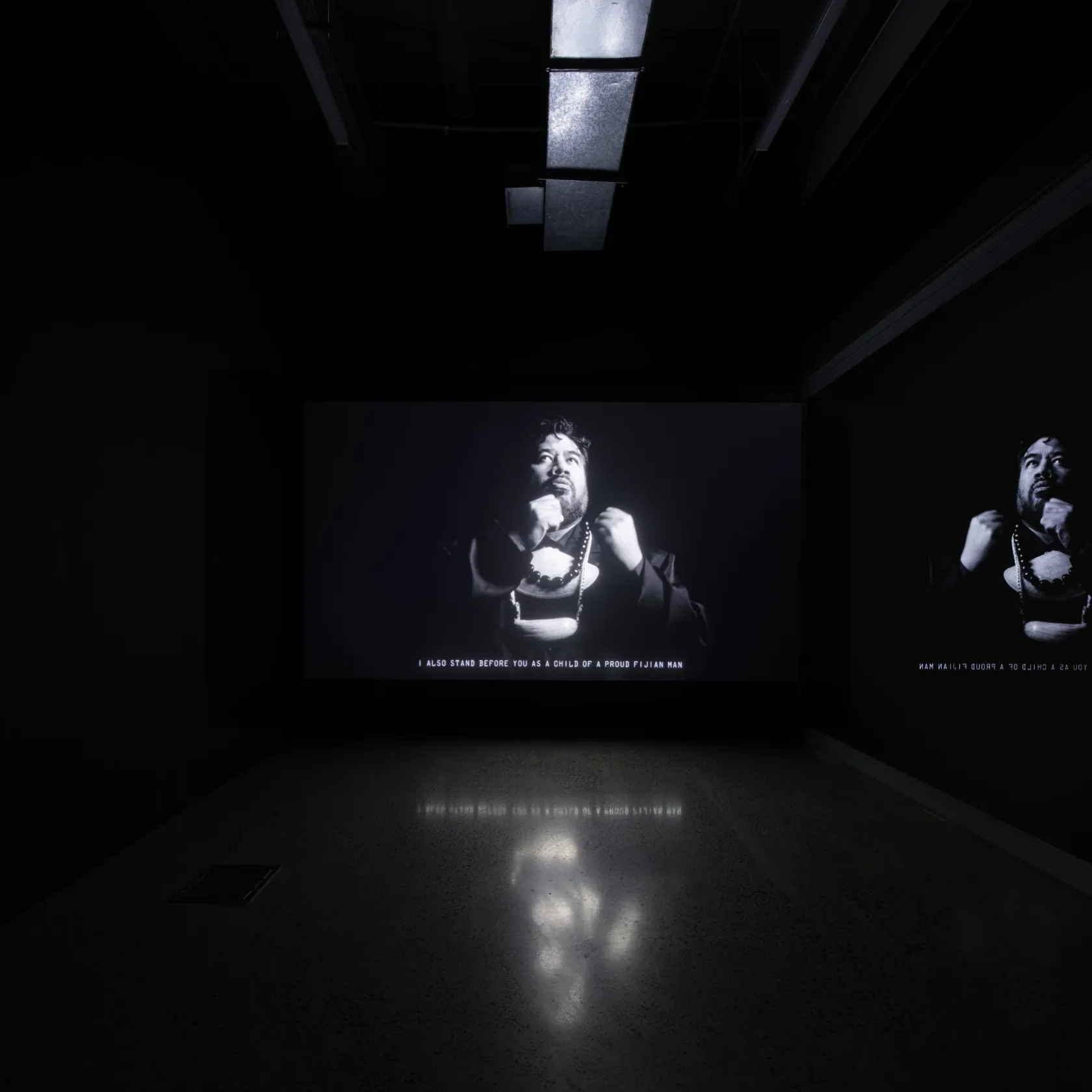 The exhibition is also the inaugural presentation of a new work in this series, which is similarly set in a not-too-distant future. Named after the i soro, a traditional Fijian model of reconciliation, Soro (2025) envisions a reenactment of the 2021 Dawn Raids Apology. Filmed in analogue black and white 35mm film, Thompson creates a dream-like atmosphere where an inferred yet unnamed Prime Minister delivers the speech out of frame. The camera focuses entirely on recognised NZSL interpreter Alan Wendt, who delivers and performs the address in Aotearoa's third official language. Set ten years after former Prime Minister Jacinda Ardern’s apology, Thompson's film imagines a bold and expansive set of reparations, including comprehensive compensation for victims of the raids, unrestricted travel for Pacific people to and from Aotearoa, and reparations for harms caused by climate change.